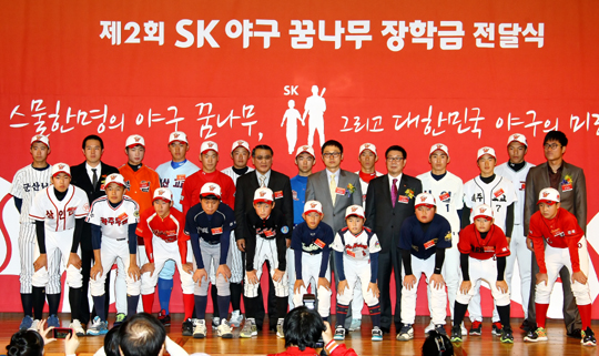 SK는 15일 오전 서울 리베라 호텔에서 열린 '제 2회 SK 야구 꿈나무 장학금 시상식'을 가졌다. 초·중·고교별로 대상 각 1명과 우수상 각 6명 등 총 21명을 선정했다. 대상은 각 300만원, 우수상은 각 150만원을 포함해 총 상금 3600만원이 선수들에게 나눠졌다. 이는 작년 2400만원 보다 더 늘어난 규모다.