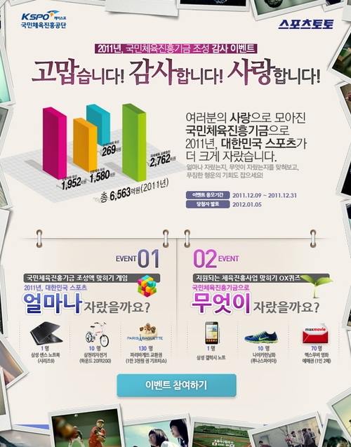 [스포츠토토] 국민체육진흥공단(www.kspo.or.kr)이 발행하는 체육진흥투표권 수탁사업자인 스포츠토토(www.sportstoto.co.kr)가 국민체육진흥기금 조성에 참여한 스포츠토토팬들에게 감사의 마음을 전하고자 마련된 '2011년 국민체육진흥기금 조성 감사 이벤트'가 오는 31일까지 실시된다.