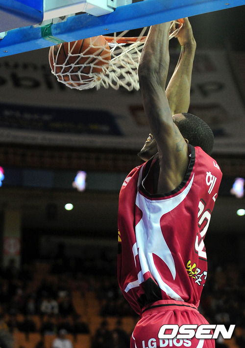 1쿼터 LG 헤인즈가 투핸드 덩크슛을 시도하고 있다.