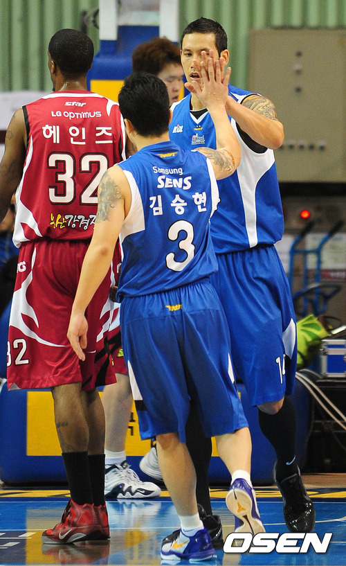 2쿼터 삼성 이승준이 어시스트를 한 김승현과 하이파이브를 하고 있다.