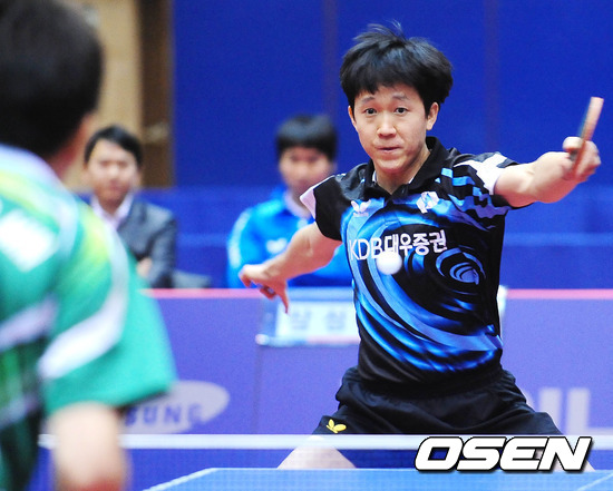 16일 오후 부천시 송내사회체육관에서 열린 '2011 MBC 탁구 최강전' 챔피언결정전 2차전 남자부 삼성생명과 대우증권의 경기 1단식 대우증권 윤재영이 공격을 하고 있다.