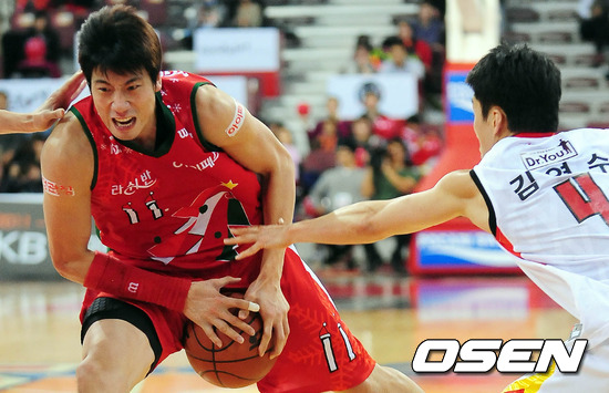 16일 오후 안양 실내체육관에서 열린 '2011-2012 KB국민카드 프로농구' 안양 인삼공사와 고양 오리온스의 경기 2쿼터 인삼공사 양희종이 골밑돌파를 시도하고 있다.