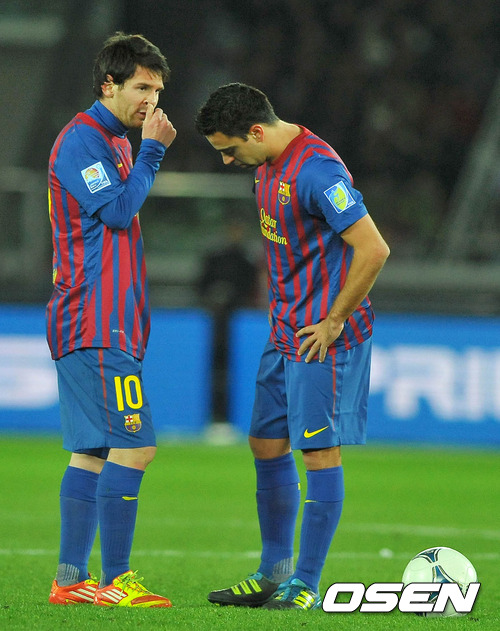후반 메시와 사비가 프리킥을 차기 전 의견을 나누고 있다. /song@osen.co.kr