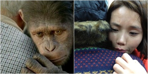사진 속 신봉선은 누군가의 품에 안겨 슬픈 표정을 짓고 있다. 또 다른 사진에는 신봉선의 포즈와 비슷한 원숭이 시저의 모습이 담겨있다. 시저는 영화 '혹성탈출-진화의 시작'에 등장하는 원숭이.