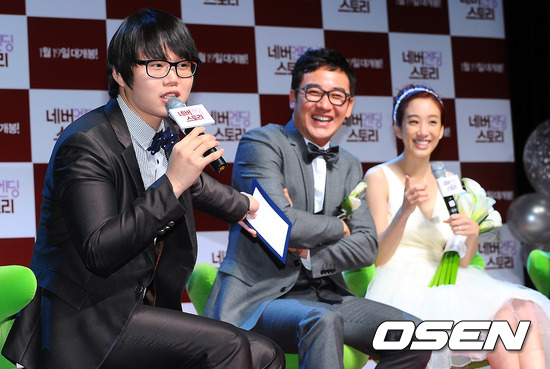 19일 오전 서울 이화여고 100주년 기념관에서 진행된 영화 '네버엔딩 스토리' 제작보고회에서 진행을 맡은 개그맨 최효종이 배우 엄태웅과 정려원의 행동에 멘트를 하고 있다.