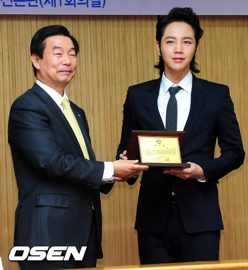 [OSEN = 백승철 기자] 장근석이 19일 오후 서울 왕십리 한양대학교 총장실에서 열린 학교 발전 기금 전달식에 참석해 임덕호 총장과 기념촬영을 하고 있다.