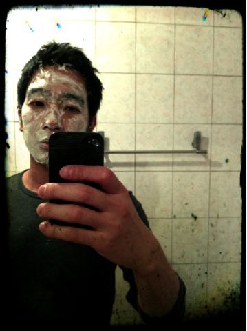 사진 속 고영욱은 얼굴에 비누칠을 한 채 핸드폰으로 거울에 비친 자신의 모습을 찍고 있다. 어두운 사진의 배경과 하얀 그의 얼굴이 마치 공포 영화의 한 장면 같아 시선을 사로잡고 있다.