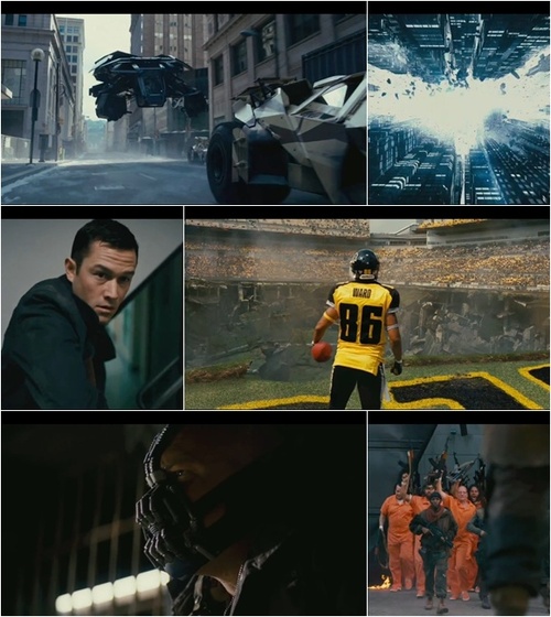 영화는 '다크 나이트'로부터 8년이 흐른 시점을 배경으로, 미식축구 경기를 앞두고 한 소년이 국가를 부르는 것으로 시작해 베인과 알프레드, 그리고 주인공 브루스 웨인이 차례로 등장한다. 예고편은 평화가 찾아온 고담에 또 한번 불어닥치는 폭풍을 예상케 하며 새로운 캣우먼 셀리나 카일의 모습도 보여준다. 베인과 함께 거리로 나선 범죄자들, 베인에 의해 쑥대밭이 되는 미식축구 경기장, 베인과 배트맨의 최후의 결전을 암시하는 전투 장며 등의 모습이 인상적이다.