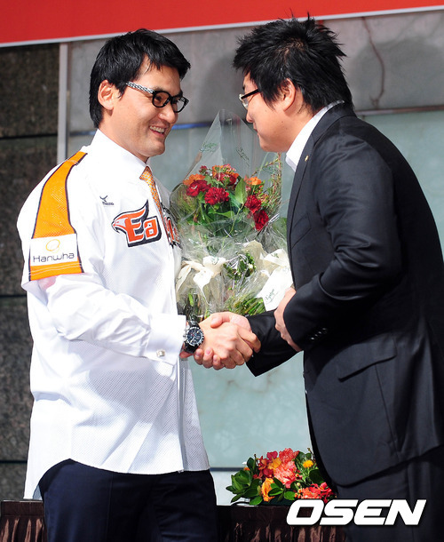 [OSEN = 백승철 기자] 박찬호(38)가 20일 오전 서울 소공로 플라자호텔에서 열린 한화 입단식에서 김태균으로부터 꽃다발을 받고 있다.
