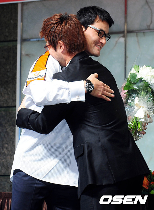 [OSEN = 백승철 기자] 박찬호(38)가 20일 오전 서울 소공로 플라자호텔에서 열린 한화 입단식에서 한화 한상훈과 포옹을 하고 있다.