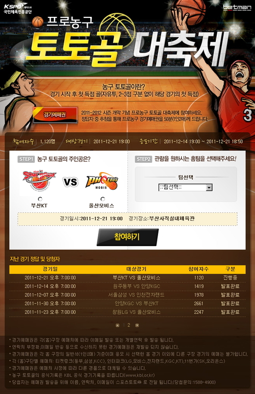 한편 추첨을 통해 '토토골'의 주인공을 맞힌 농구팬 50명을 뽑아 자신이 원하는 팀의 홈경기를 관전할 수 있는 경기 예매권(1인 2매)을 경품으로 지급한다.