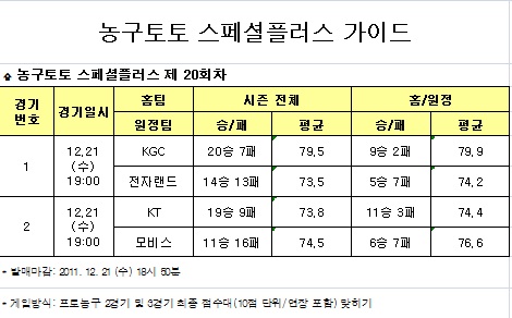 농구토토 스페셜플러스 20회차 게임은 경기 시작 10분 전인 21일 오후 6시 50분에 발매가 마감된다.