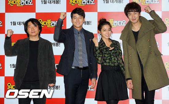 20일 오후 서울 동대문 메가박스에서 진행된 영화 '원더풀 라디오' 언론시사회에서 출연배우들과 권칠인 감독이 파이팅을 하고 있다