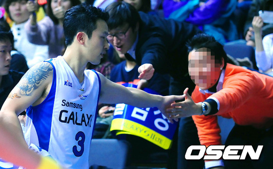 20일 오후 고양체육관에서 열린 '2011-2012 KB국민카드 프로농구' 고양 오리온스와 서울 삼성의 경기 2쿼터 종료 후 삼성 김승현이 한 팬과 하이파이브를 하고 있다.