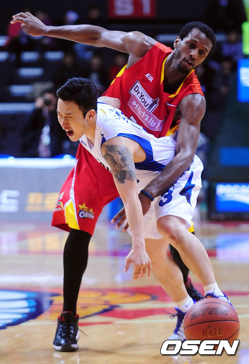 20일 오후 고양체육관에서 열린 '2011-2012 KB국민카드 프로농구' 고양 오리온스와 서울 삼성의 경기 4쿼터 삼성 김승현이 오리온스 윌리엄스와의 볼다툼에서 넘어지고 있다.