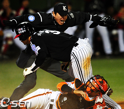 서동욱은 이미 윤규진이 투구를 하기 전 스타트를 끊었고 포수 이희근은 깔끔한 블로킹으로 홈을 지키고 있던 상황. 누가 보더라도 아웃이 될 것 같은 상황에서 서동욱은 슬라이딩을 하다 말고 급제동을 걸었고, 이희근의 포수 미트를 살짝 뛰어넘는 '개구리 점프'를 보여주며 세이프 판정을 받았습니다. 한국 프로야구 35번째 홈스틸로 기록될 수도 있는 장면이었지만 기록원의 결정은 폭투였는데요.