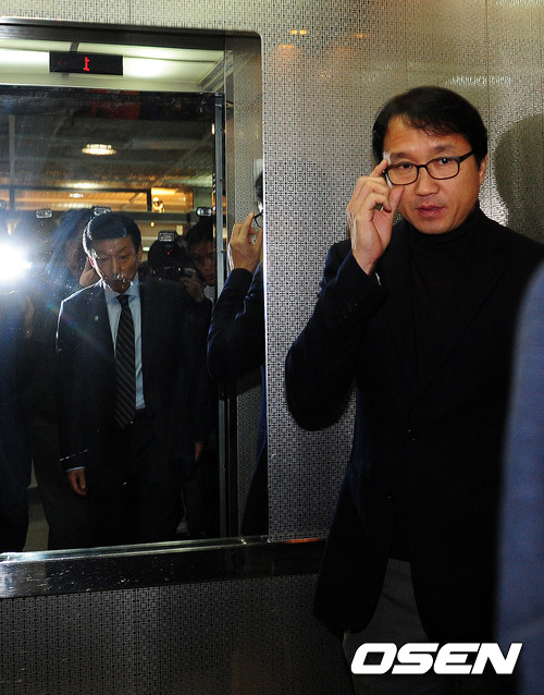 황보관 기술위원장이 기자회견을 마친 최강희 감독을 엘리베이터에서 기다리고 있다.