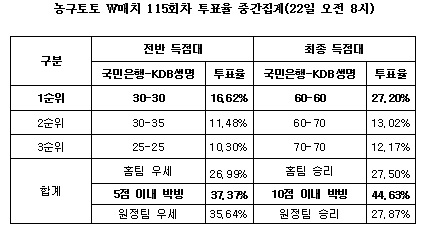 국민체육진흥공단(www.kspo.or.kr)이 발행하는 체육진흥투표권 수탁사업자인 오리온그룹 계열의 스포츠토토 공식 온라인 발매 사이트 베트맨(www.betman.co.kr)이 12월 23일(금) 오후 5시 청주종합체육관에서 벌어지는 국민은행-KDB생명전 대상 농구토토 W매치 115회차 게임 투표율을 중간 집계한 결과, 전체 참가자의 44.63%는 양 팀간 10점 이내 박빙 승부를 예상했다.