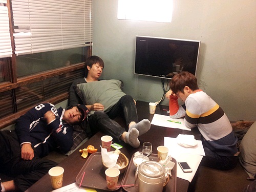 사진 속 유상무는 테이블 위해 다리를 올려놓은 채 곤히 잠들어 있다. 피곤했던지 깊이 잠들어 있는 개그맨 장동민의 모습도 보인다. 그들 앞에는 고민에 빠져 있는 개그맨 유세윤의 모습도 보인다.