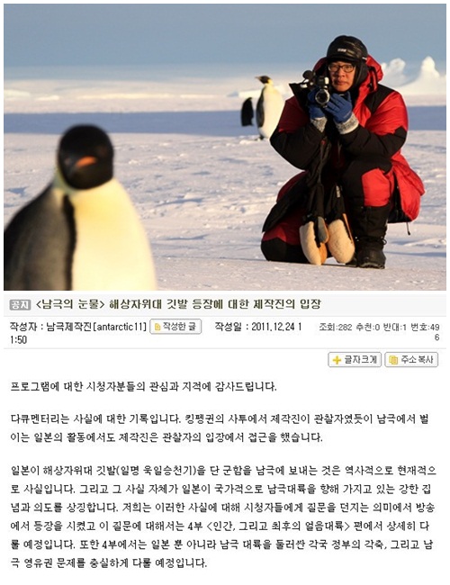 이어 “다큐멘터리는 사실에 대한 기록입니다. 킹펭귄의 사투에서 제작진이 관찰자였듯이 남극에서 벌이는 일본의 활동에서도 제작진은 관찰자의 입장에서 접근을 했습니다”라고 말했다.