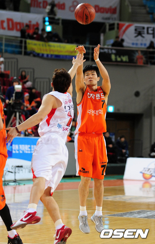 1쿼터 전자랜드 강혁이 SK 변기훈의 블록슛을 피해 3점슛을 시도하고 있다.