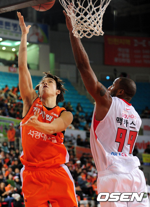 1쿼터 전자랜드 함누리가 SK 맥카스킬의 블록슛을 피해 레이업슛을 시도하고 있다.