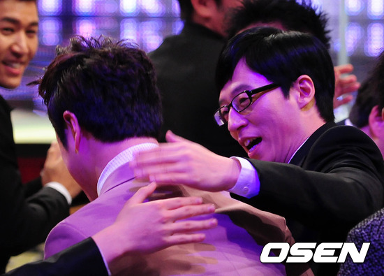 개그맨 유재석이 코미디 남자 부문 우수상을 수상한 김원효를 축하하고 있다.