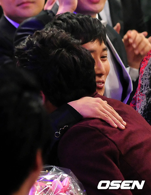 개그맨 김병만이 쇼오락MC 남자 부문 최우수상을 수상한 이수근을 축하하고 있다.