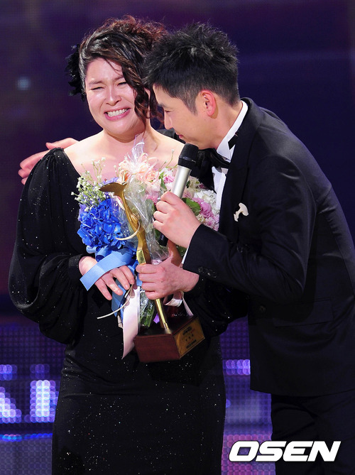개그맨 신동엽이 쇼오락MC 여자 부문 최우수상을 수상한 이영자를 축하하고 있다.