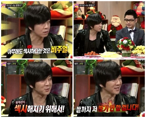 특히 그는 내년 계획에 대해 말하며 “지금 팔굽혀펴기를 100개 하는데, 내년에는 110개 하고 싶다. 섹시해 지기 위해 몸매관리를 해야 한다. 어떻게 얻은 수식어 인데 끝까지 포기 할 수 없다”며 섹시한 이미지에 집착하는 모습을 보여 웃음을 자아냈다.