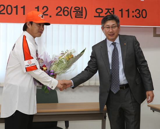 한화 송신영의 뒤늦은 입단식이 26일 대전시 용전동 구단 사무실에서 열렸습니다. LG에서 FA가 되어 지난달 20일 한화와 3년간 총액 13억원의 조건으로 계약을 맺은 송신영은 조금 늦은 입단식을 통해 공식 한화맨으로 공인받았습니다. 이 자리에는 정승진 사장, 노재덕 단장, 한대화 감독이 모두 참석하며 그에 대한 기대를 내비쳤습니다.