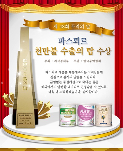 제 42회 수출의 날 기념식에서 파스퇴르 분유가 1,000만불 수출의 탑을 수상했다.