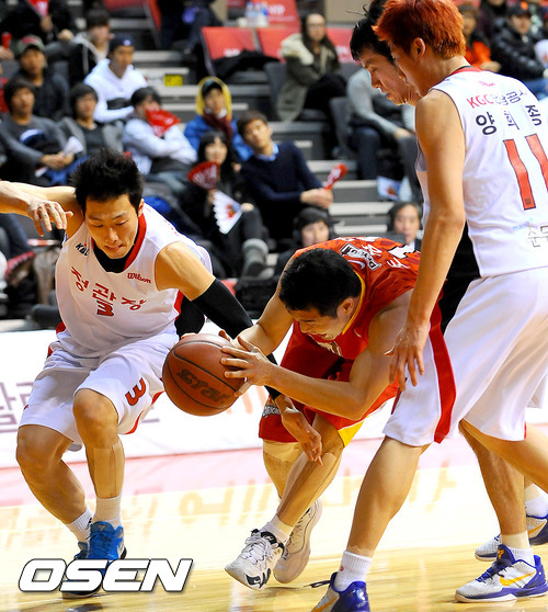 27일 오후 경기도 고양시 일산동구 고양체육관서 열린 '2011-2012 KB국민카드 프로농구' 고양 오리온스와 안양 KGC의 경기 2쿼터 오리온스 조상현이 루즈볼을 차지하고 있다.