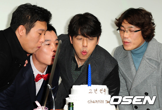 TEAM106 류시원 감독을 비롯한 선수들과 관계자가 축하 케이크에 촛불을 불고 있다.