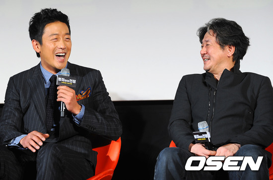 28일 오전 서울 동대문 메가박스에서 진행된 영화 '범죄와의 전쟁' 제작보고회에서 배우 하정우와 최민식이 미소 짓고 있다.