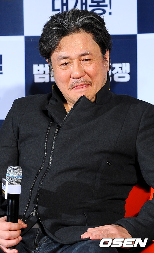 28일 오전 서울 동대문 메가박스에서 진행된 영화 '범죄와의 전쟁' 제작보고회에서 배우 최민식이 멋쩍은 미소를 짓고 있다.