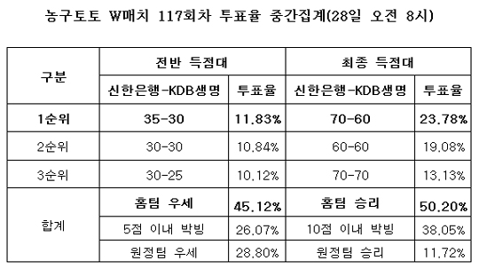 2011-2012시즌 농구토토 W매치 117회차 투표율 중간집계 결과