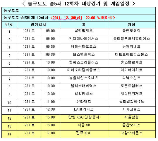 체육진흥투표권 수탁사업자인 오리온그룹의 스포츠토토(www.sportstoto.co.kr)는 오는 31일 열리는 미국프로농구(NBA) 11경기와 한국프로농구(KBL) 3경기 등 총 14경기를 대상으로 농구토토 승5패 12회차 게임을 발행한다.