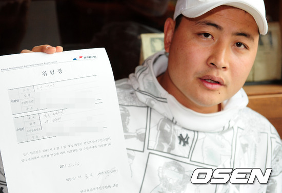 두산 이혜천이 동료선수들의 위임장을 꺼내 보이고 있다.