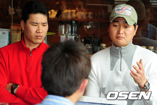 KIA 김상현과 LG 박명환이 심각한 표정으로 취재진과 이야기를 나누고 있다.