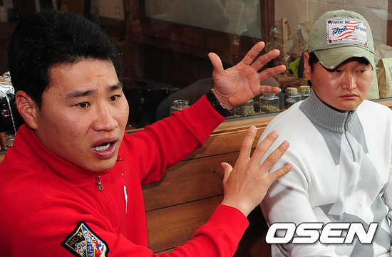 KIA 김상현, LG 박명환이 심각한 표정으로 취재진과 이야기를 나누고 있다.