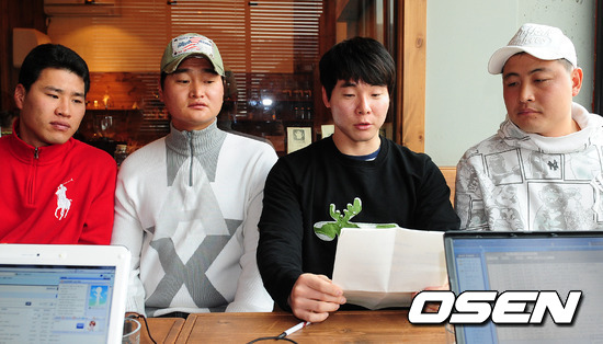 LG 박명환, KIA 김상현, 삼성 현재윤, 두산 이혜천이 28일 오후 경기도 용인시 모처에 모여 박충식 선수협 사무총장 사퇴 촉구 성명서를 발표하고 있다.
