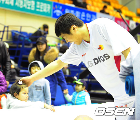 28일 오후 원주 치악 체육관에서 열린 '2011~2012 KB국민카드 프로농구' 윈주 동부와 창원 LG의 경기가 열리기 전 몸을 풀던 LG 서장훈이 자신의 훈련을 지켜보던 여자 아이의 머리를 쓰다듬고 있다.