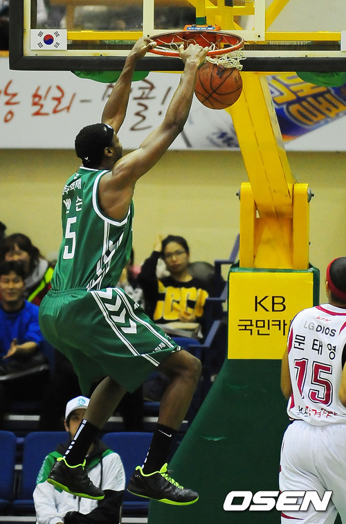 28일 오후 원주 치악 체육관에서 열린 '2011~2012 KB국민카드 프로농구' 윈주 동부와 창원 LG의 경기에서 1쿼터 동부 벤슨이 덩크를 내리꽂고 있다.