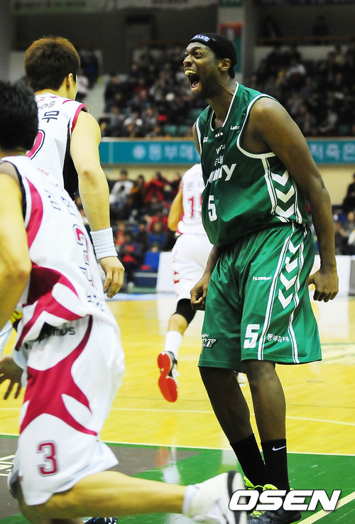28일 오후 원주 치악 체육관에서 열린 '2011~2012 KB국민카드 프로농구' 윈주 동부와 창원 LG의 경기에서 3쿼터 동부 벤슨이 LG 송창무의 블로킹을 피해 슛을 성공시킨 후 소리를 지르고 있다.