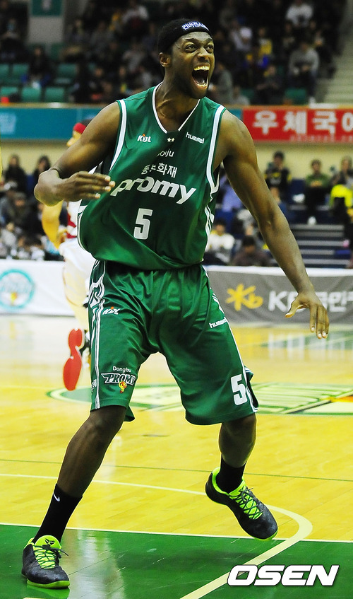 28일 오후 원주 치악 체육관에서 열린 '2011~2012 KB국민카드 프로농구' 윈주 동부와 창원 LG의 경기에서 3쿼터 동부 벤슨이 LG 송창무의 블로킹을 피해 슛을 성공시킨 후 소리를 지르고 있다.