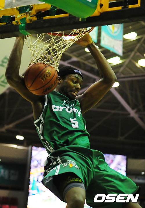 28일 오후 원주 치악 체육관에서 열린 '2011~2012 KB국민카드 프로농구' 윈주 동부와 창원 LG의 경기에서 3쿼터 동부 벤슨이 투핸드 덩크를 내리꽂고 있다.