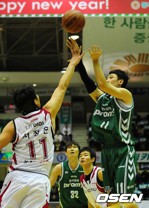 28일 오후 원주 치악 체육관에서 열린 '2011~2012 KB국민카드 프로농구' 윈주 동부와 창원 LG의 경기에서 3쿼터 동부 황진원이 LG 서장훈의 블로킹을 피해 점프슛을 날리고 있다.