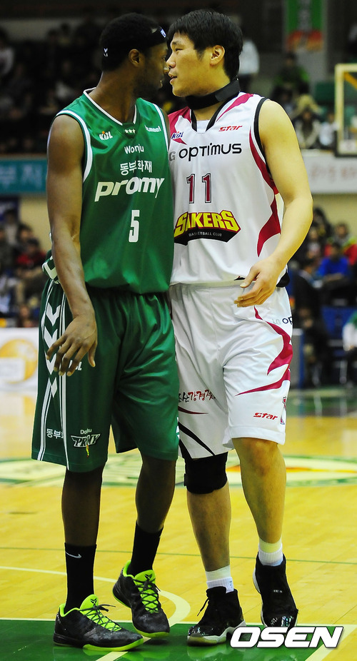 28일 오후 원주 치악 체육관에서 열린 '2011~2012 KB국민카드 프로농구' 윈주 동부와 창원 LG의 경기에서 1쿼터 동부 벤슨과 LG 서장훈이 몸을 부딪히며 얘기를 나누고 있다.