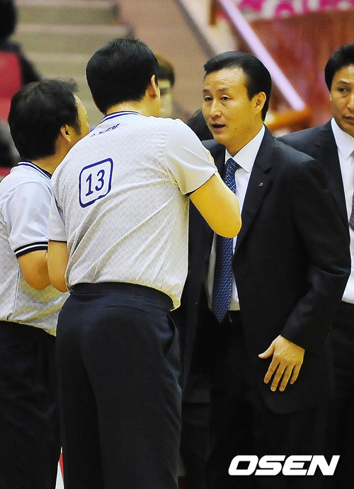 28일 오후 원주 치악 체육관에서 열린 '2011~2012 KB국민카드 프로농구' 윈주 동부와 창원 LG의 경기에서 1쿼터 종료직전 동부 안재욱이 버저비터를 성공시키자 LG 김진 감독이 심판에게 항의하고 있다.